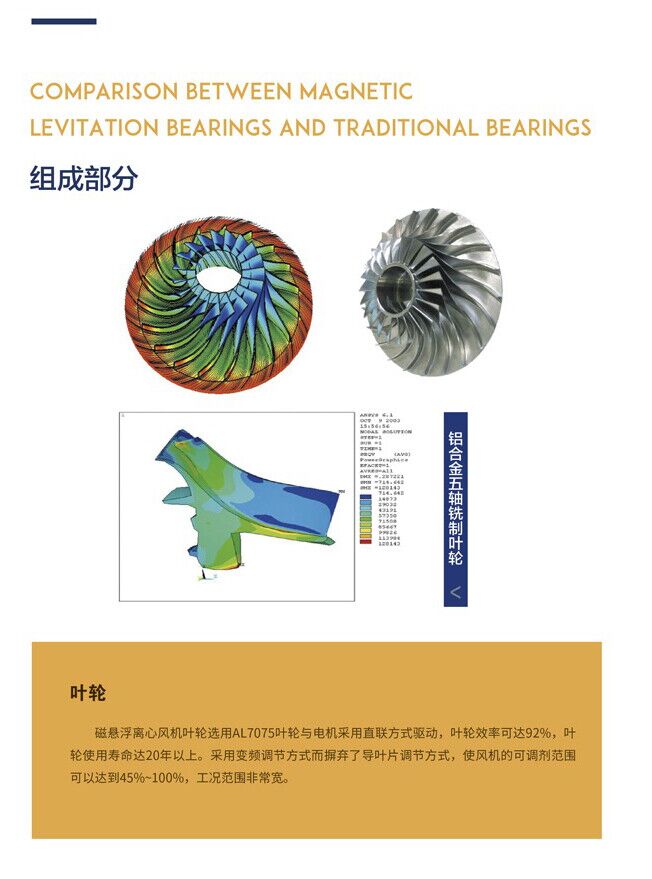 磁懸浮離心風(fēng)機的葉輪采用AL7075鋁合金材質(zhì),通過與電機直接連接驅(qū)動。葉輪效率可達92%,使用壽命可達20年以上。風(fēng)機轉(zhuǎn)速調(diào)節(jié)范圍可達45%~100%,工作范圍非常寬廣。