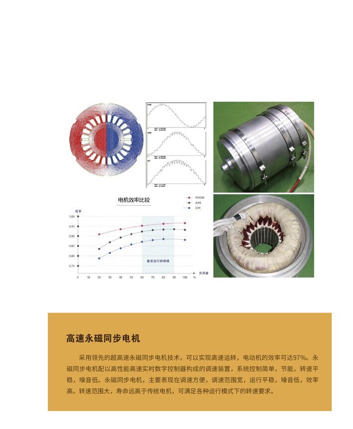 采用領(lǐng)先的超高速永磁同步電機技術(shù),可實現(xiàn)高速運行,電機效率可達97.9%。永磁同步電機配備由高性能高速實時數(shù)字控制器組成的調(diào)速裝置。該系統(tǒng)具有控制簡便、節(jié)能、轉(zhuǎn)速穩(wěn)定、噪音低等優(yōu)點。永磁同步電機的主要特點是調(diào)速方便、調(diào)速范圍寬、運行穩(wěn)定、噪音低、效率高。其調(diào)速范圍大,使用壽命遠超傳統(tǒng)電機,能夠滿足各種運行模式下的轉(zhuǎn)速需求。